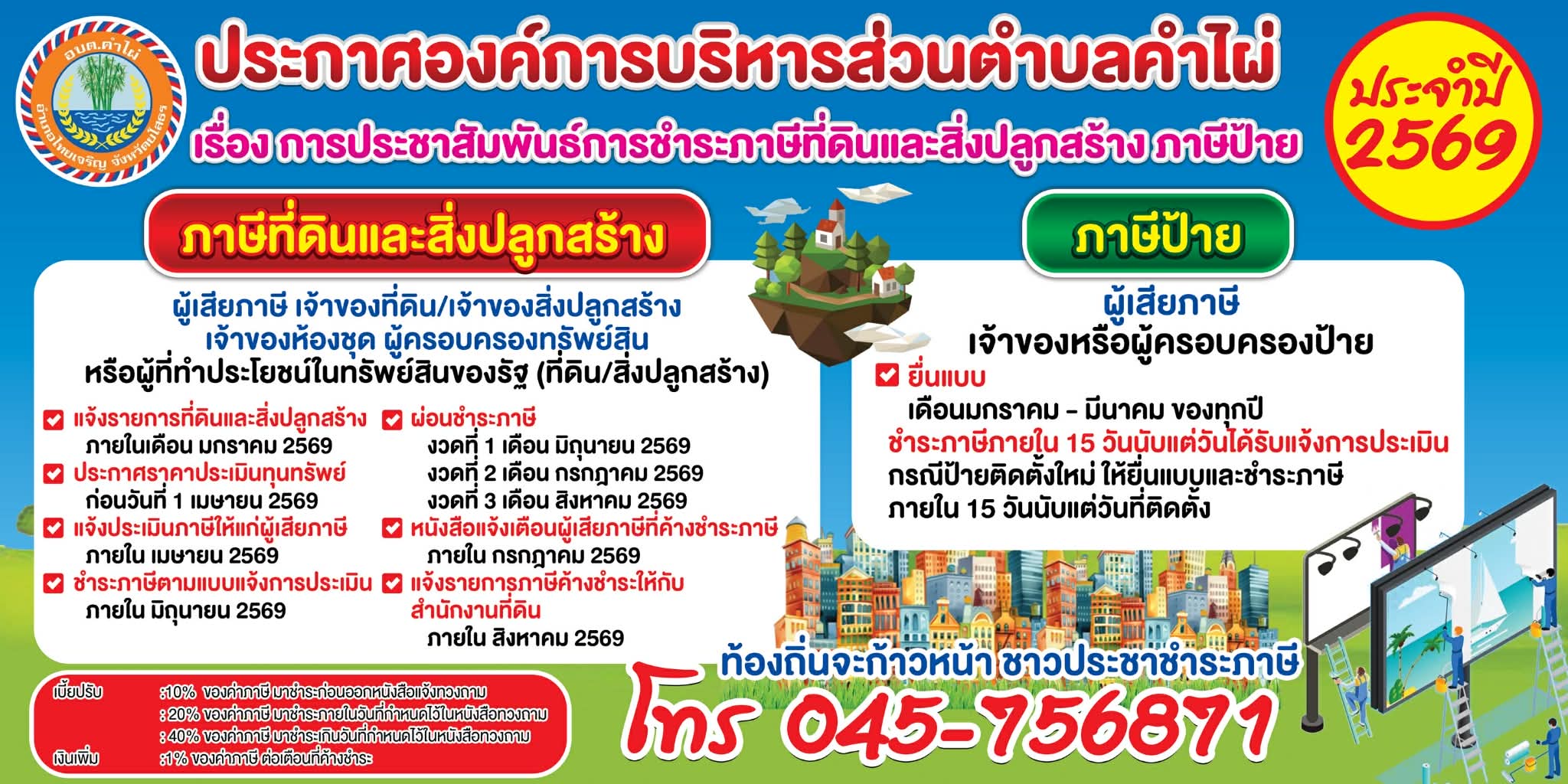 องค์การบริหารส่วนตำบลคำไผ่ ประกาศประชาสัมพันธ์การชำระภาษีที่ดินและสิ่งปลูกสร้าง ภาษีป้าย ประจำปี 2569